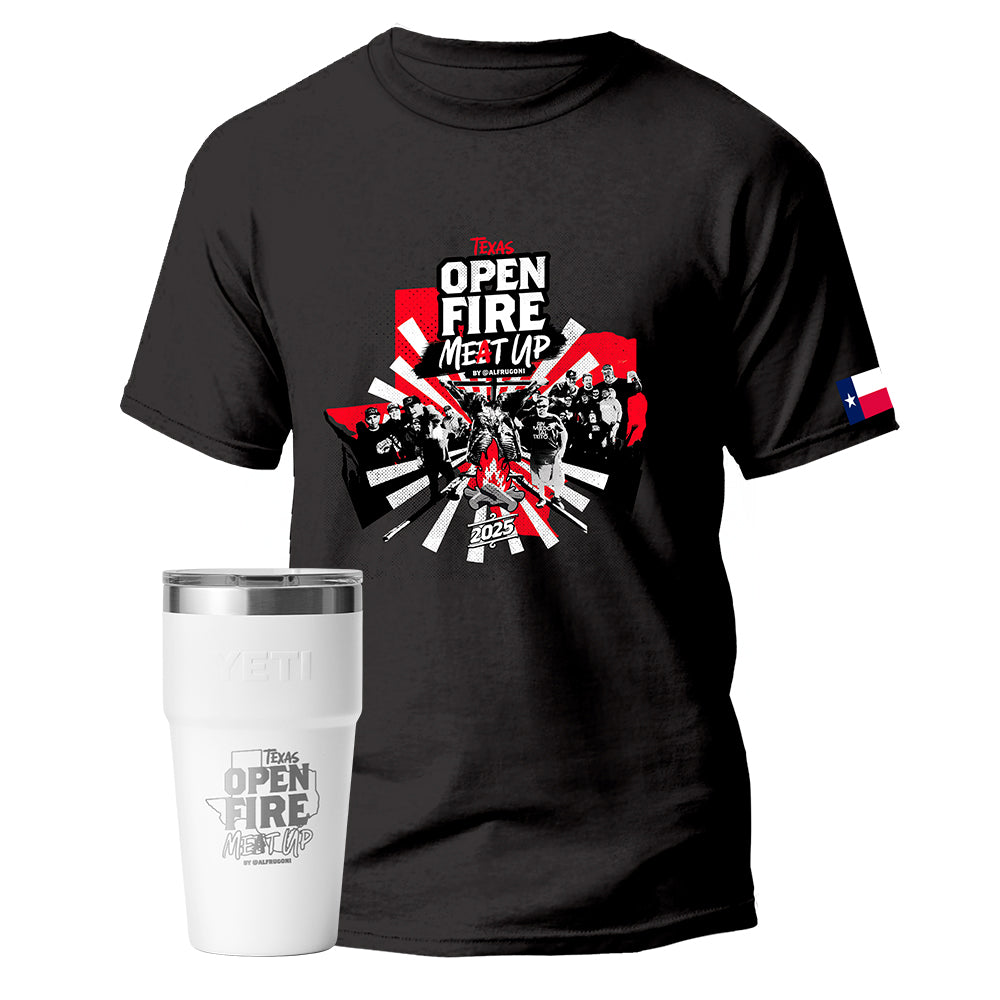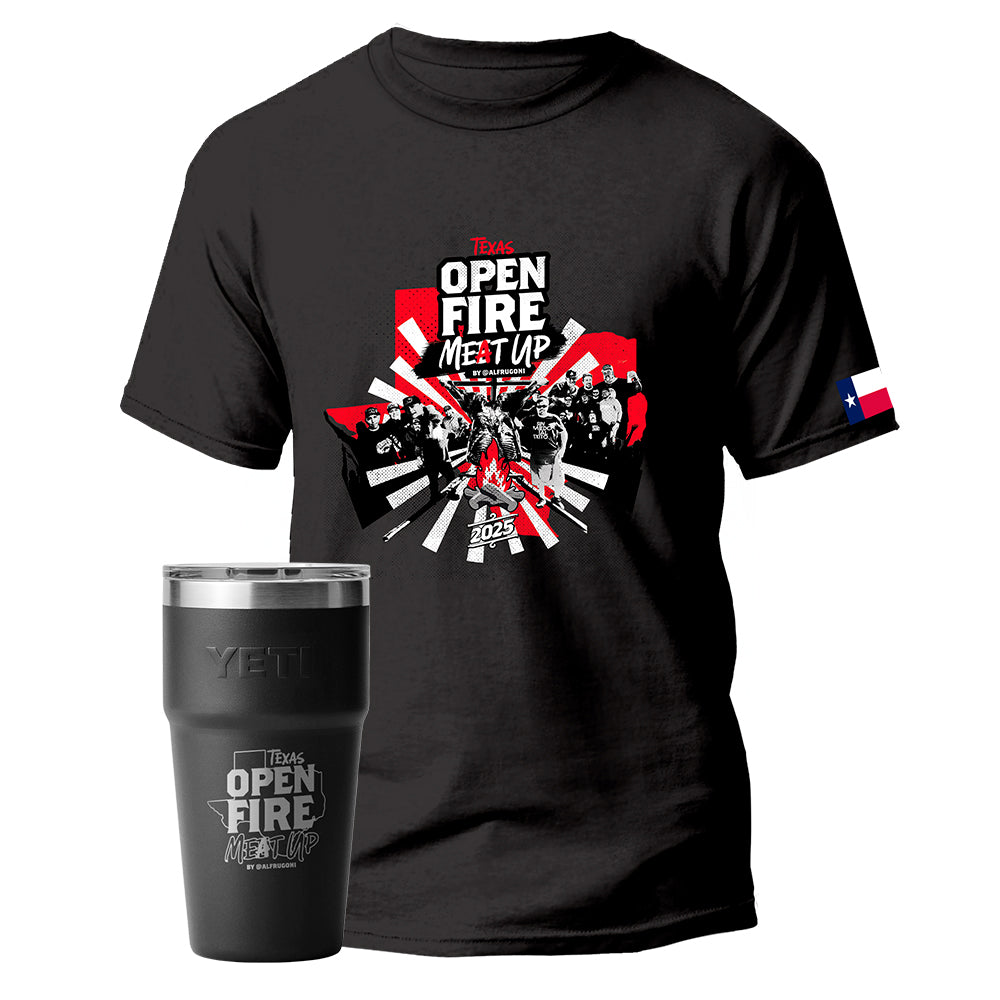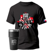 This bundle includes an Open Fire Meat Up t-shirt + YETI RAMBLER STACKABLE 20oz, and the mug color…